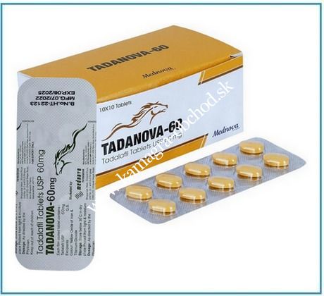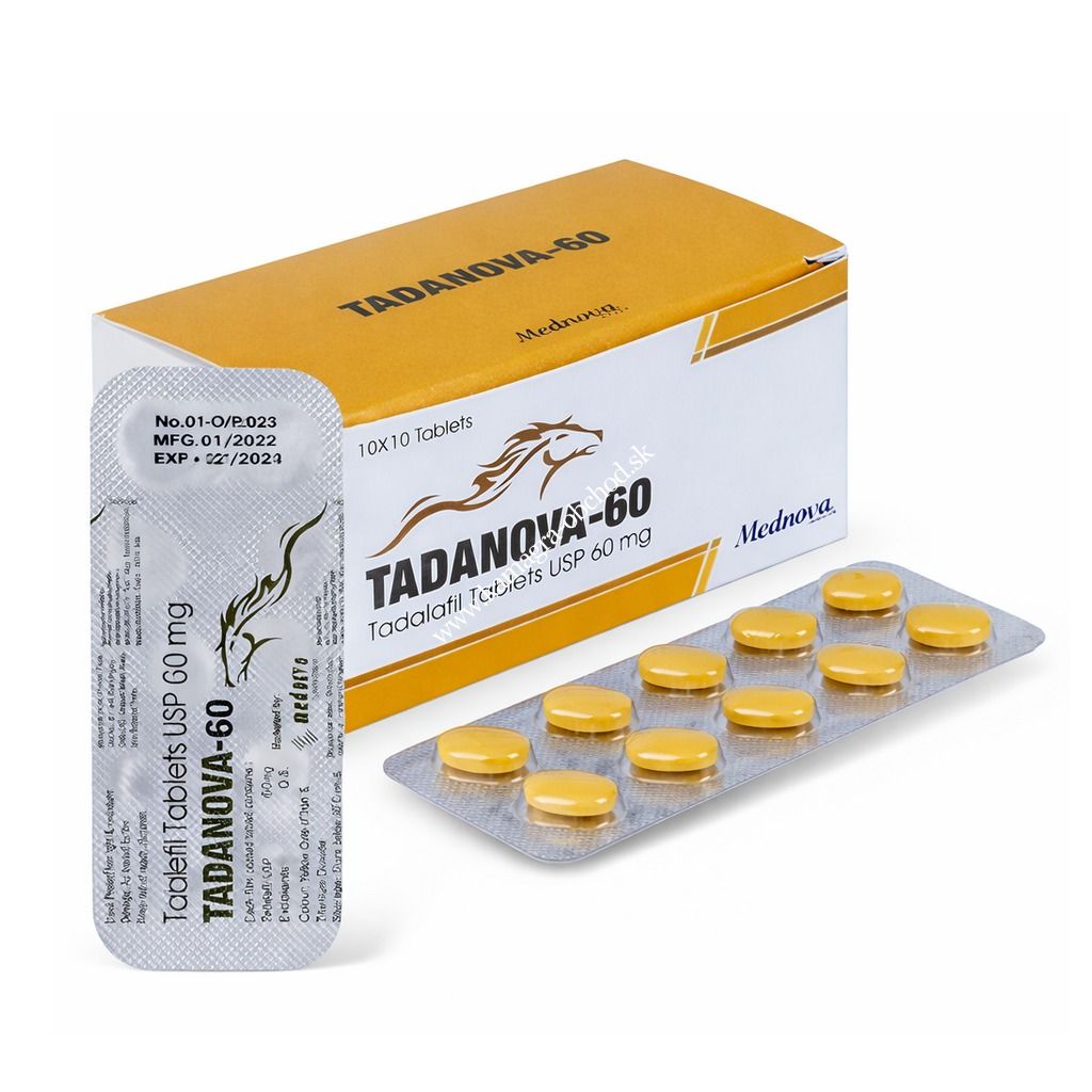 Tadanova 60mg (Tadalafil) je vyrábaný spoločnosťou Mednova Pharmaceuticals a je to najobľúbenejší náhrada (generikum) Cialisu (Tadalafil). Tadarise je liek pre mužov ktorí trpia poruchami erekcie alebo ak erektilnou dysfunkciou a po jej užití je možné prakticky každému mužovi dosiahnuť kvalitné erekcie a teda si užiť lepší sexuálny styk. Tadanova (Tadalafil) môže účinkovať až 36 hodín, to je oveľa dlhšie, než Viagra (Sildenafil) alebo ostatné prípravky obsahujúce látku Sildenafil citrate. Z tohto dôvodu je často nazývaný "víkendové tableta".